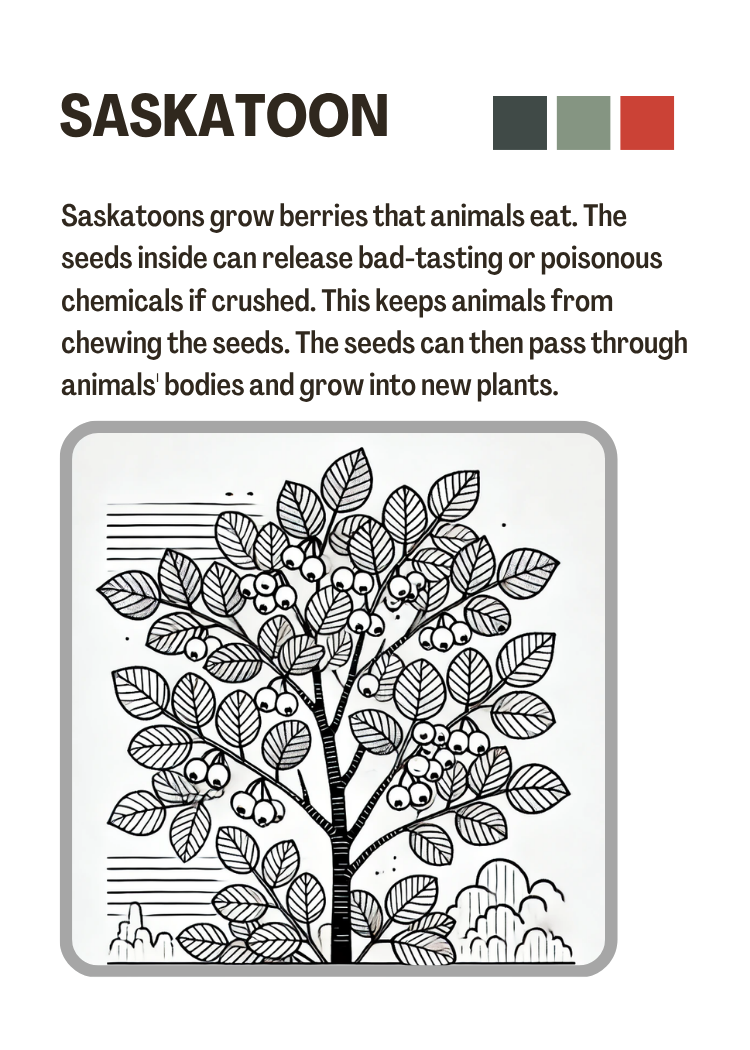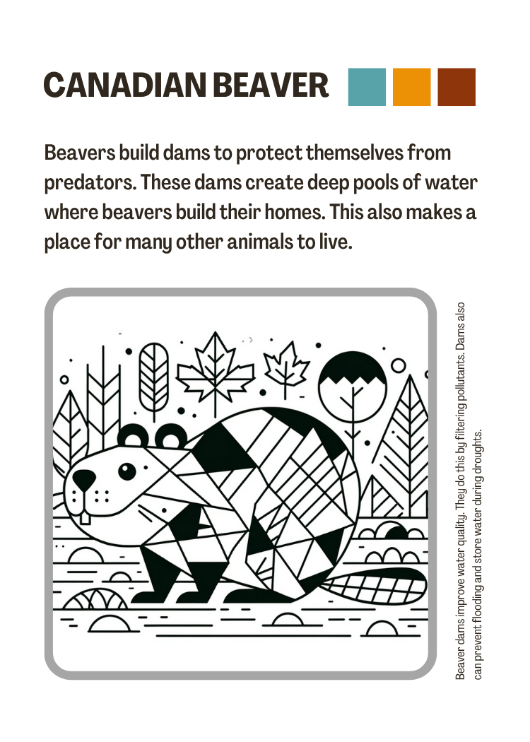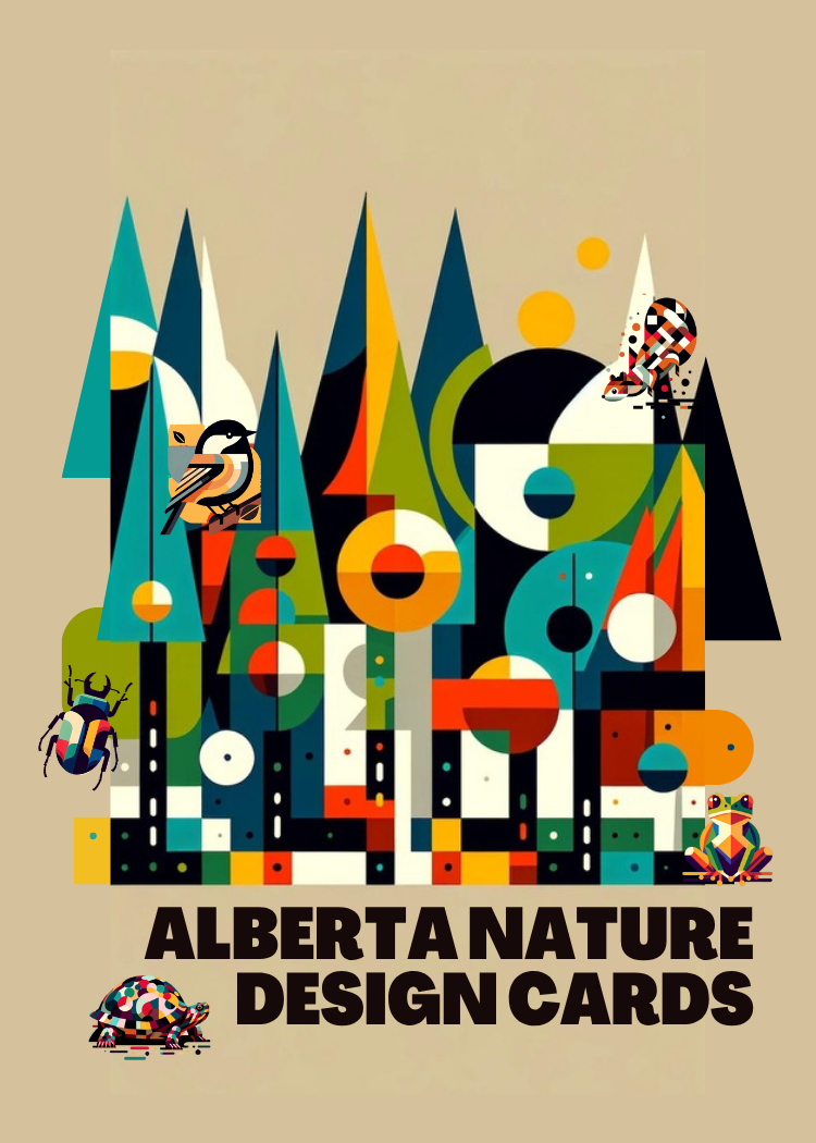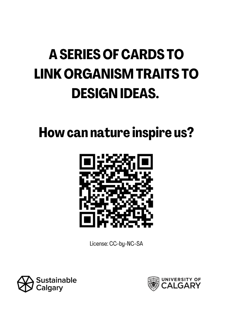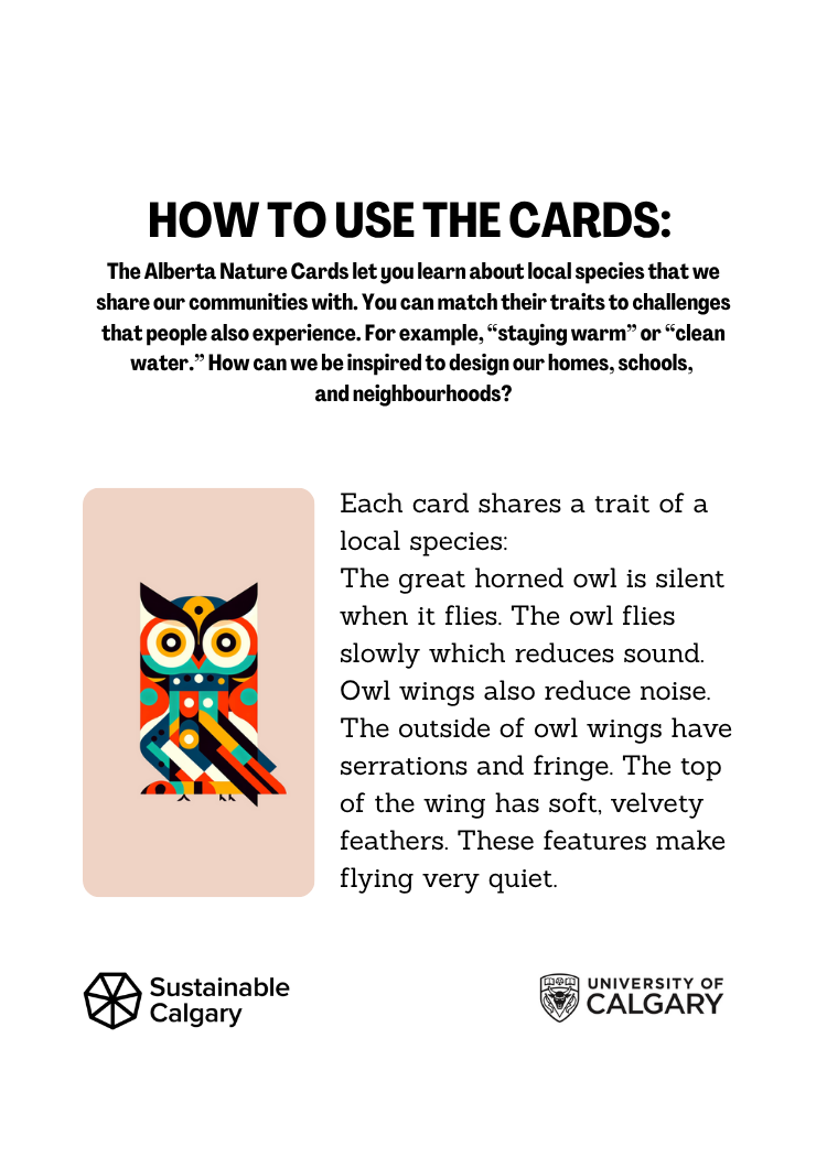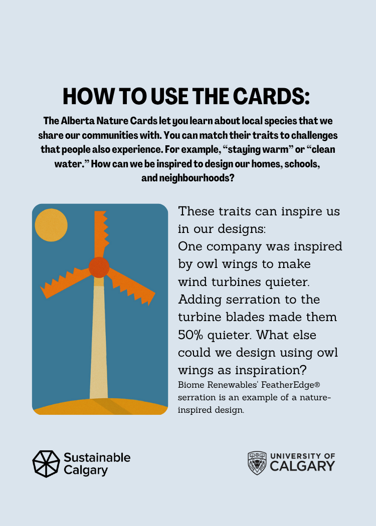 Click a card to flip a card: The Alberta Nature Cards let you learn about local species that we share our communities with. You can match their traits to challenges that people also experience (see the blue cards at the bottom of this page). For example, “staying warm” or “clean water.” How can we be inspired to design our homes, schools, and neighbourhoods?