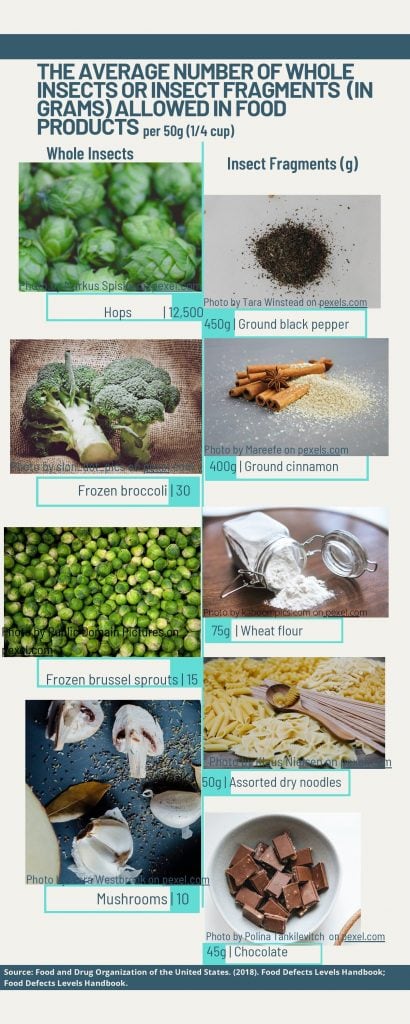 The foods we eat are carefully regulated to ensure that there are no hazardous levels of insects/other materials. Food inspection agencies set limits for the maximum amount of insect matter (in grams) that can be allowed in a food quantity declared unhazardous for consumption (FDA 2018). Individual insects ending up in food after harvest is therefore normal and non-threatening (Hagstrum et al. 2012). However, stored food items (e.g., cereals, grains) should be discarded if live insects are found, as live insects can carry harmful fungal toxins and bacteria on their exoskeletons (Hagstrum et al. 2012). To learn more about how our foods are kept safe, see Safe Foods for Canadians Act and the FDA Food Defect Levels Handbook.